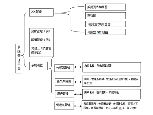 例如隧道管理、尾礦庫管理,系統預留接口,每增加一樣管理類型,就直接增加模塊到主界面。點擊XX管理后,會列出所有管理點的名稱,也可以通過行政區劃來查找管理點名稱,例如,查找湘西自治州花垣縣,然后列出花垣縣下面所有管理點。點擊管理點,出現子菜單: